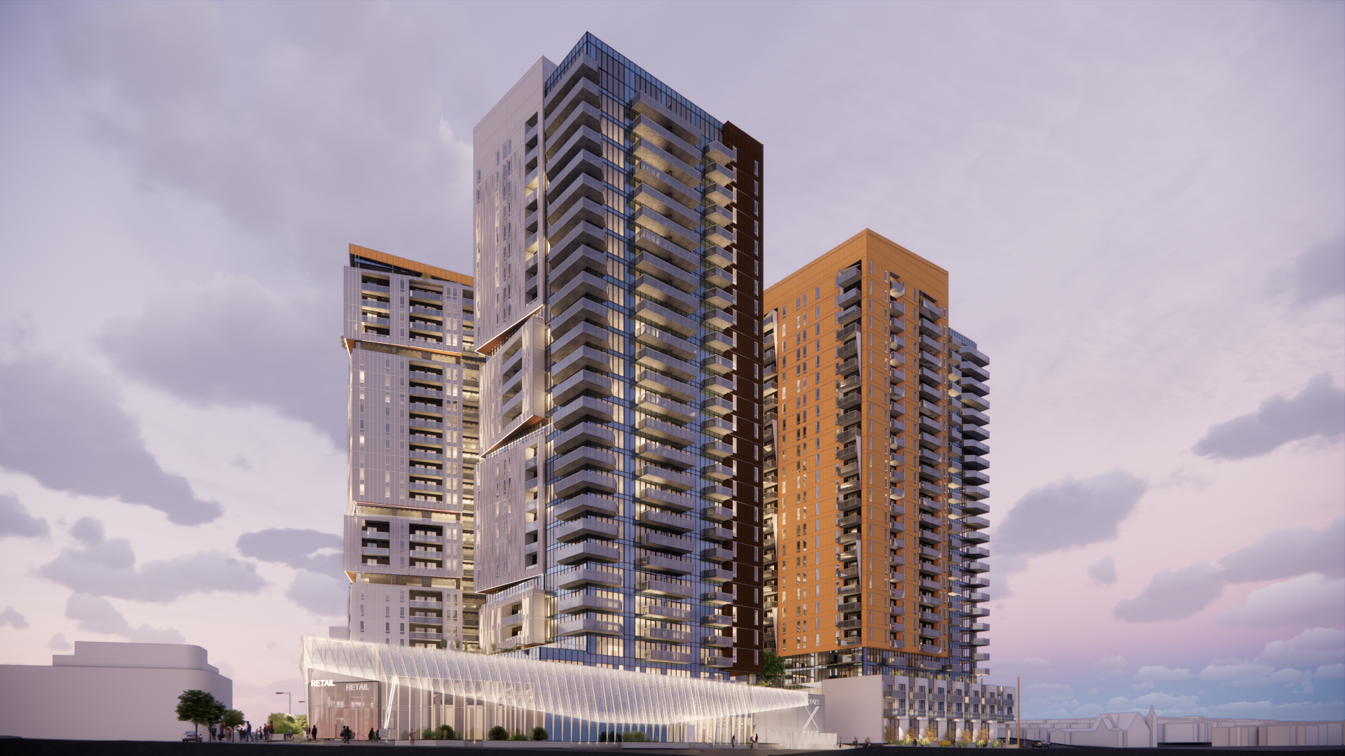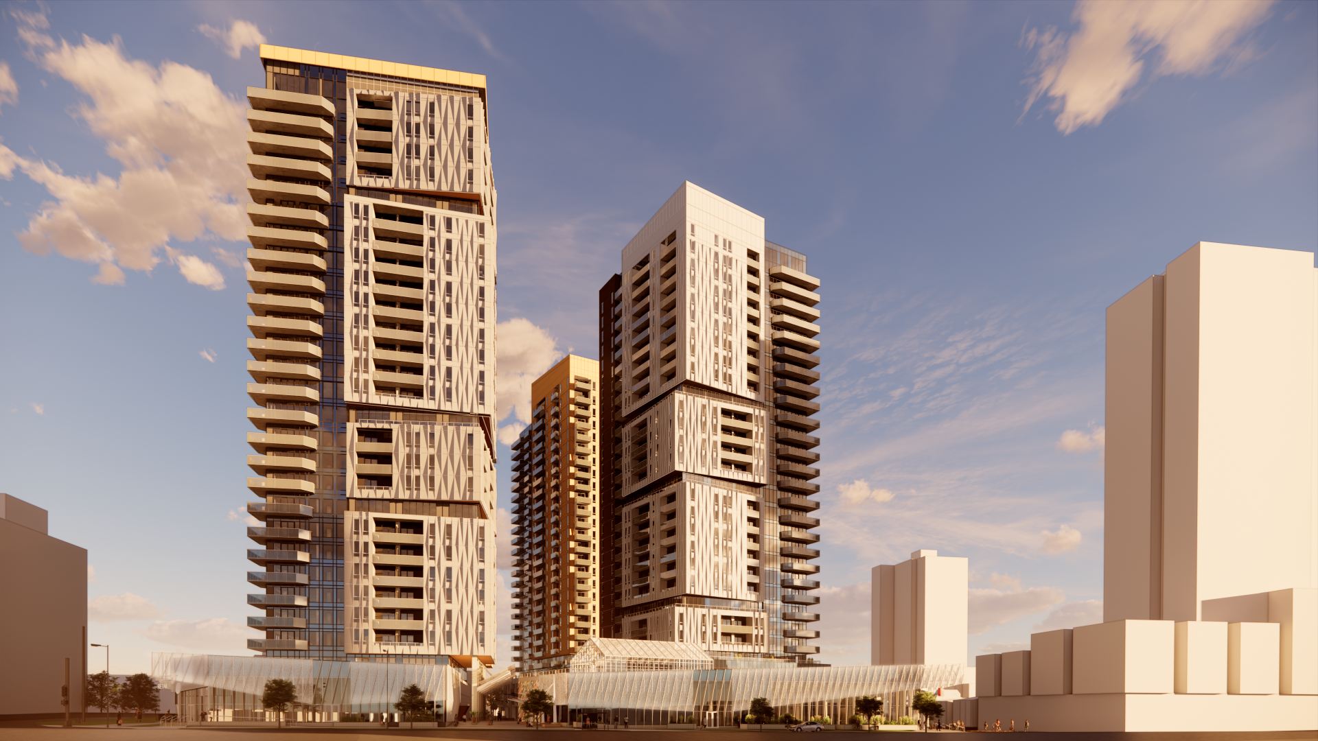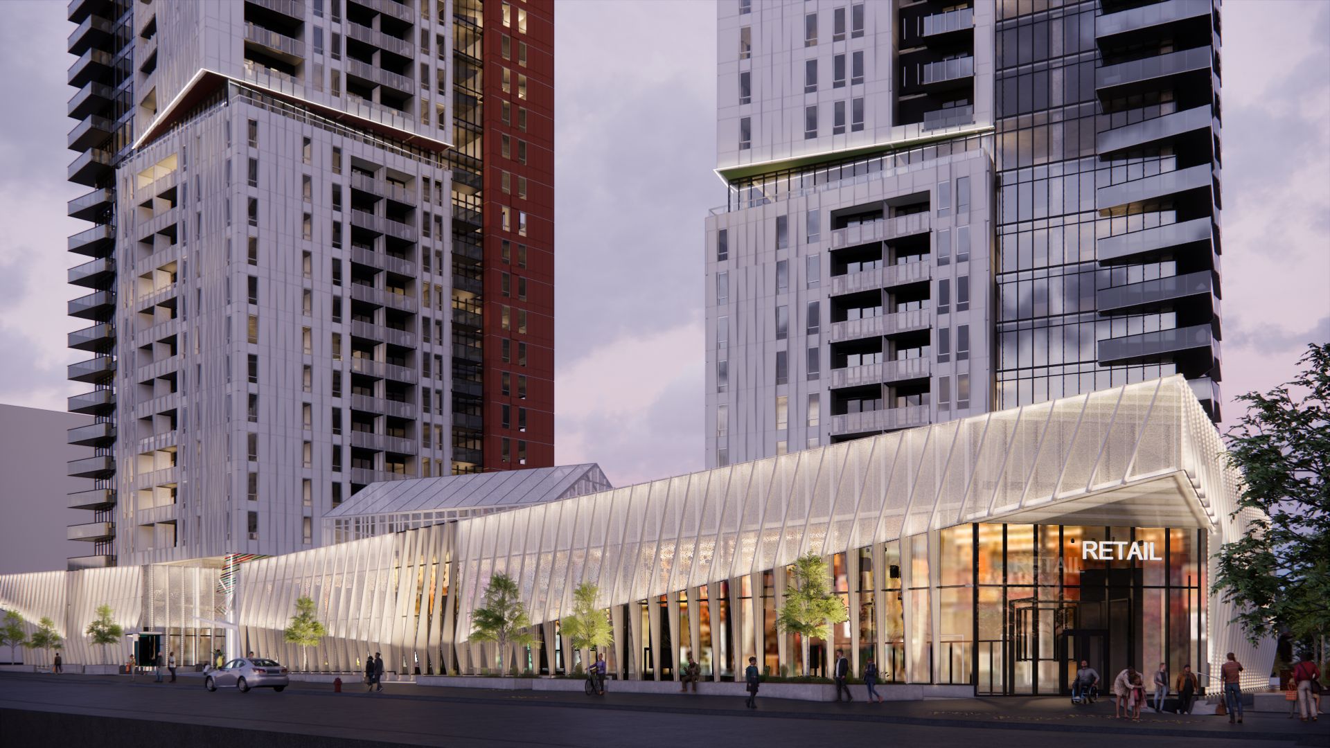 The design for St Pats Crossing is informed by desire lines and the angular shapes they define. Angular masses rise up along Quinpool Street with striking soffit lines reaching out to create dynamic public plazas at corner conditions. Angled column silhouettes march along the street frontage creating an urban rhythm along the pedestrian realm.